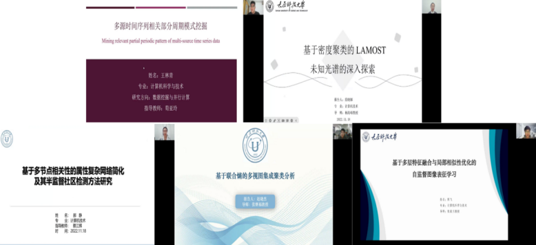数据挖掘与智能信息系统实验室自2000年创建以来,在张继福教授带领下,已形成数据挖掘与机器学习、并行计算和计算机视觉等主要研究方向。本次研讨会,实验室5名优秀研究生代表(王林青、殷晓娜、郝静、赵晓杰、陈飞),在各研究方向上分别对周期模式挖掘、LAMOST Unknown光谱数据分析、复杂网络简化及其半监督社区检测方法、多视图集成聚类分析和自监督图像表征学习等相关研究内容介绍了自己的研究进展以及创新成果。