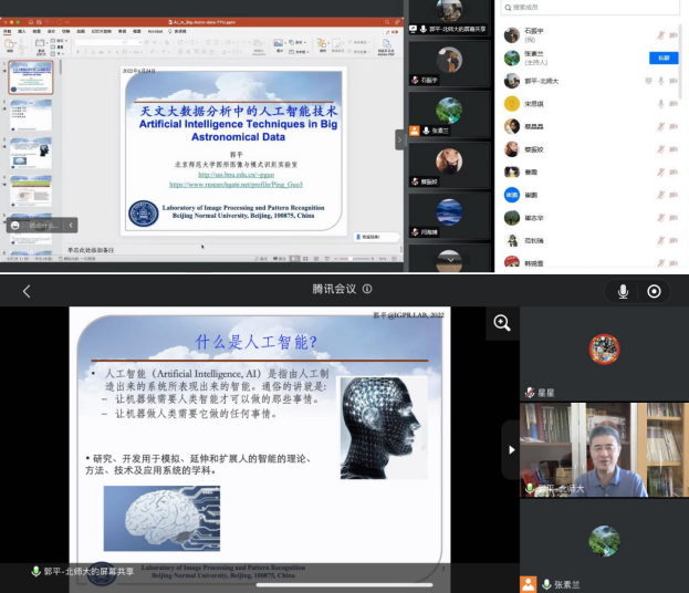 2022年6月24日,受学院张素兰教授的邀请,北京师范大学图形图像与模式识别校级实验室(创建人)主任郭平教授做了线上学术报告,报告题目为“天文大数据分析中的人工智能技术”,学术报告由崔志华副院长主持,学院部分教师及研究生100余人参加了学术会议。