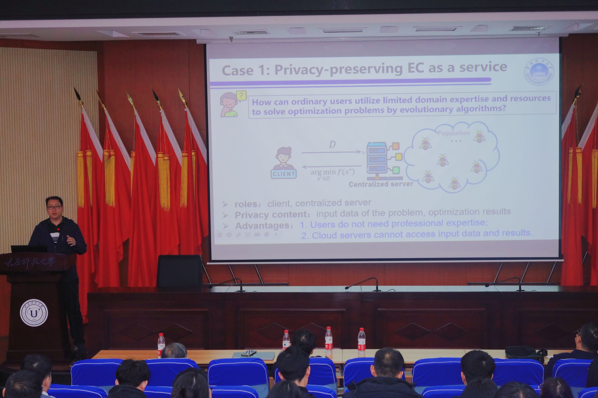 华南理工大学陈伟能教授针对多智能分布式群智进化优化,分别介绍了面向全局一致性的分布式协同进化方法以及边—云协同代理模型驱动的进化算法。