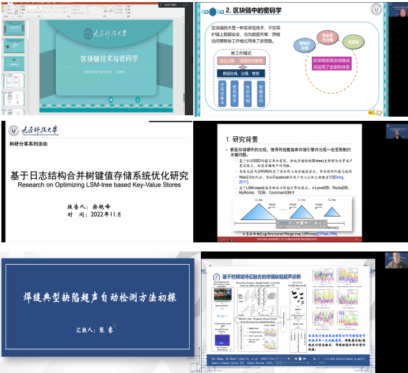 高改梅博士首先做了题为“区块链技术与密码学”的学术报告,以区块链技术和密码学为基础内容,介绍了密码学在区块链安全中的应用,并探讨了区块链密码学中存在的难点。随后,柴艳峰博士做了题为“基于日志结构合并树的键值存储系统优化研究”,围绕数据应用服务质量的提升,从优化LSM-tree合并机制、构建自适应LSM-tree结构,以及基于相关性的键值存储自动调优系统三个方面分别做了详细介绍。接着,张睿博士做了题为“焊缝典型缺陷超声自动检测方法初探”,从焊缝超声自动检测背景介绍出发,介绍了超声缺陷检测原理,分析其存在的难点问题,并从样本采集、数据预处理、决策模型构建等方面展开了详细介绍。