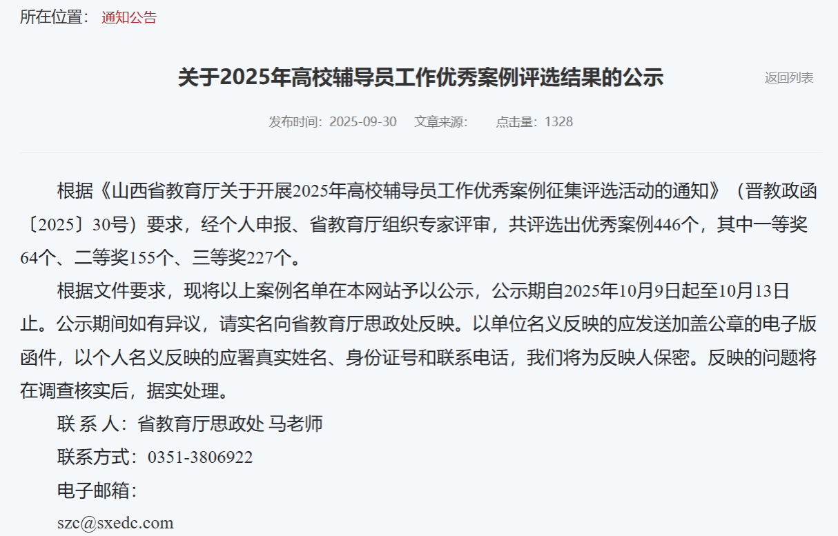 本次山西省高校辅导员工作优秀案例评选由省教育厅主办,山西省高校网络思政中心承办,旨在深入贯彻落实全国高校思想政治工作会议精神,总结推广高校辅导员在育人实践中的先进经验与典型做法,进一步提升全省辅导员队伍的职业能力和工作实效。