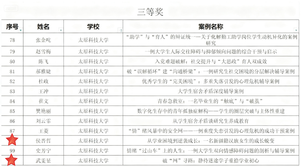 近日,山西省高校网络思政中心正式公示 2025 年高校辅导员工作优秀案例评选结果。在全省各高校推荐的数百份案例中,我院三名辅导员凭借扎实的工作基础、创新的育人思路和高质量的案例成果脱颖而出,喜获多项荣誉。其中,李明倩老师提交的案例荣获二等奖,侯晋哲老师与武雯昱老师的案例分别荣获三等奖。这一成绩充分展现了我院辅导员队伍优秀的专业素养和扎实的育人成效。