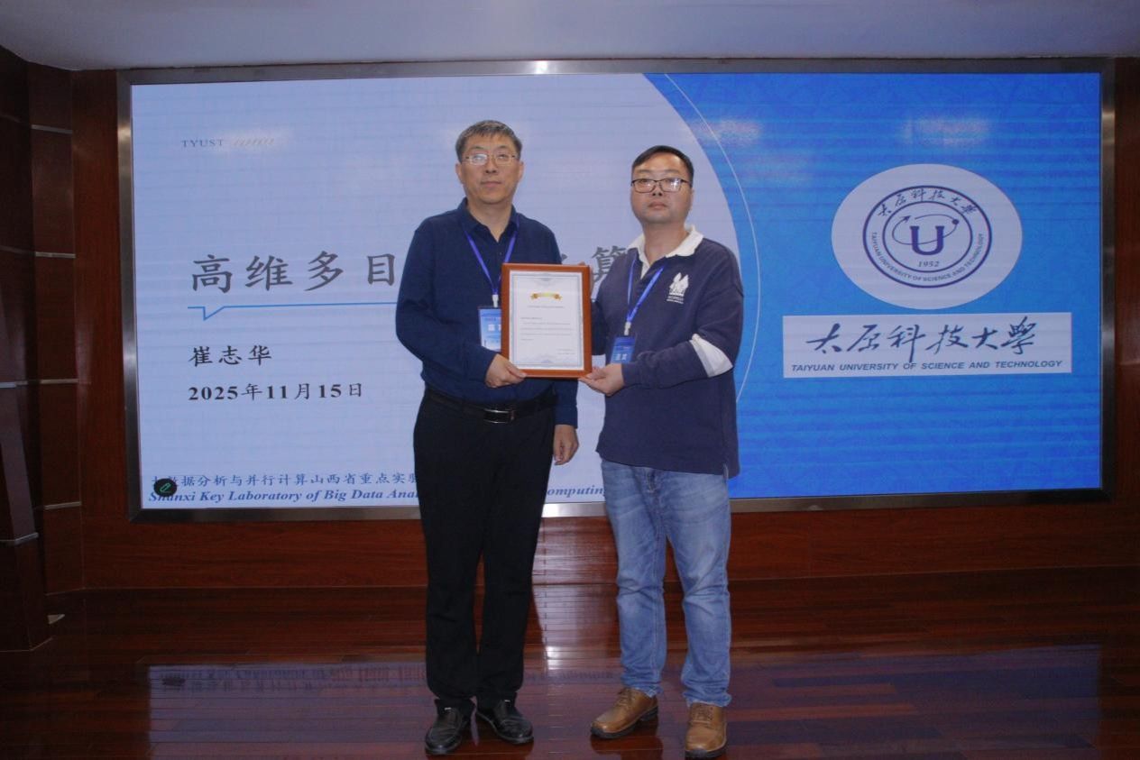 作为全球高被引科学家(2020–2025)、山西省大数据分析与并行计算重点实验室主任,崔志华教授应邀作题为《高维多目标优化算法》的大会报告,分享了团队近年来在高维多目标建模、高维多目标决策及多任务优化等方面的最新研究成果,引发了与会专家学者的广泛关注和热烈讨论。