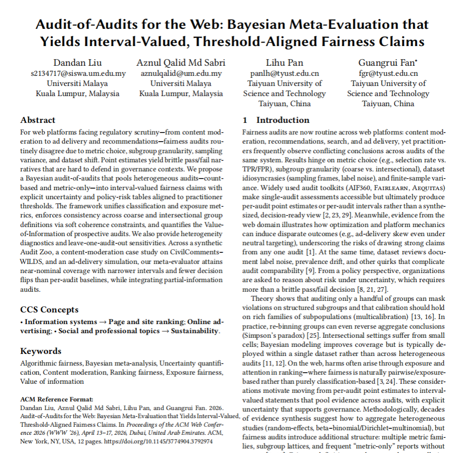 1月13日,中国计算机学会(CCF)推荐的A类国际学术会议WWW 2026公布论文接收结果,我院樊光瑞老师的论文"Audit-of-Audits for the Web: Bayesian Meta-Evaluation that Yields Interval-Valued, Threshold-Aligned Fairness Claims"被Web4Good特别赛道录用。