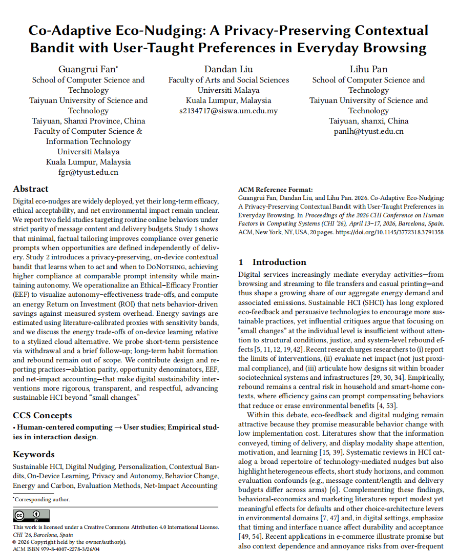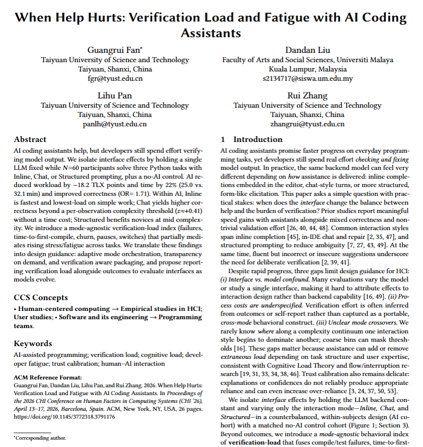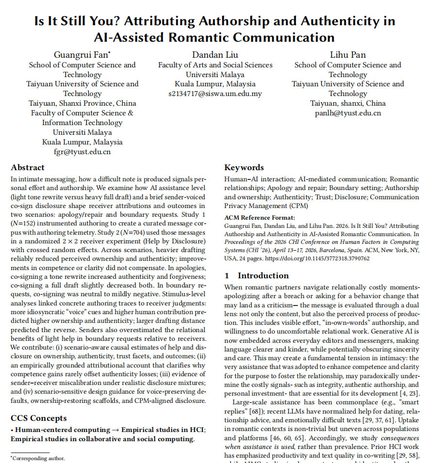 1月15日,中国计算机学会(CCF)推荐的A类国际学术会议CHI 2026公布论文接收结果,我院樊光瑞老师共有3篇论文被录用,分别为"Is It Still You? Attributing Authorship and Authenticity in AI-Assisted Romantic Communication"、"When Help Hurts: Verification Load and Fatigue with AI Coding Assistants"和"Co-Adaptive Eco-Nudging: A Privacy-Preserving Contextual Bandit with User-Taught Preferences"。