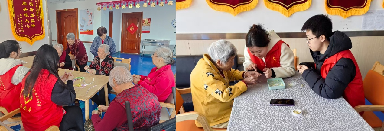 完成卫生清扫后,志愿者们来到老人活动大厅,开启了温馨的陪伴时光,大家围坐在长辈身边,先后开展了两项趣味手工活动:先是陪伴他们弯折、缠绕扭扭棒,创作生动的小造型;随后又协助他们编织暖心手链,将绳线编织成专属的精致饰品。老人们专注地跟着步骤操作,每当一件作品完成,脸上便露出孩童般的笑容,现场满是温馨与欢喜。志愿者们还陪着老人们在走廊练操、聊天,倾听他们讲述过往岁月的故事,还时不时接话附和,亲切的如同家中晚辈,现场气氛温暖又和谐。