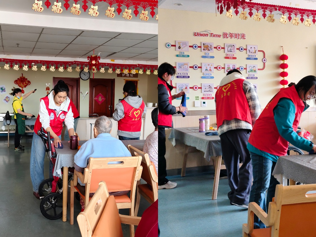 伴随着春日的暖意,志愿者们身着统一红色志愿服,乘坐大巴车如约抵达熟悉的敬老院,满怀热忱与关怀开启本次志愿服务之旅。大家听从工作人员安排开展清洁工作,认真打扫楼道卫生,擦拭扶手、清扫地面、整理公共区域,不放过任何一处角落,为老人们营造了干净整洁又充满温情的生活环境。