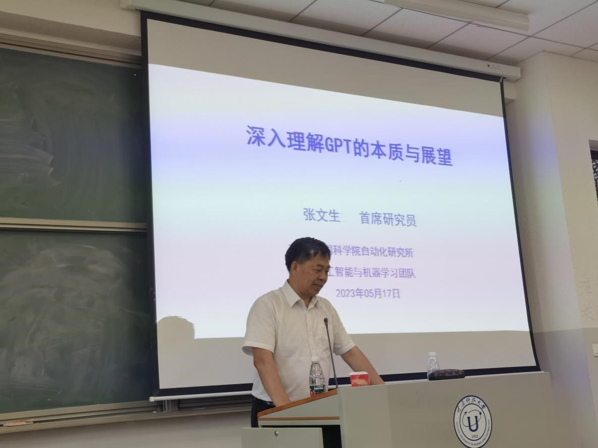 2023年5月17日下午,中国科学院自动化研究所张文生研究员应邀在西校区XGD-206教室作了题为“深入理解GPT的本质与展望”的学术报告。学院部分教师代表和研究生聆听了报告。报告会由学院院长崔志华教授主持。