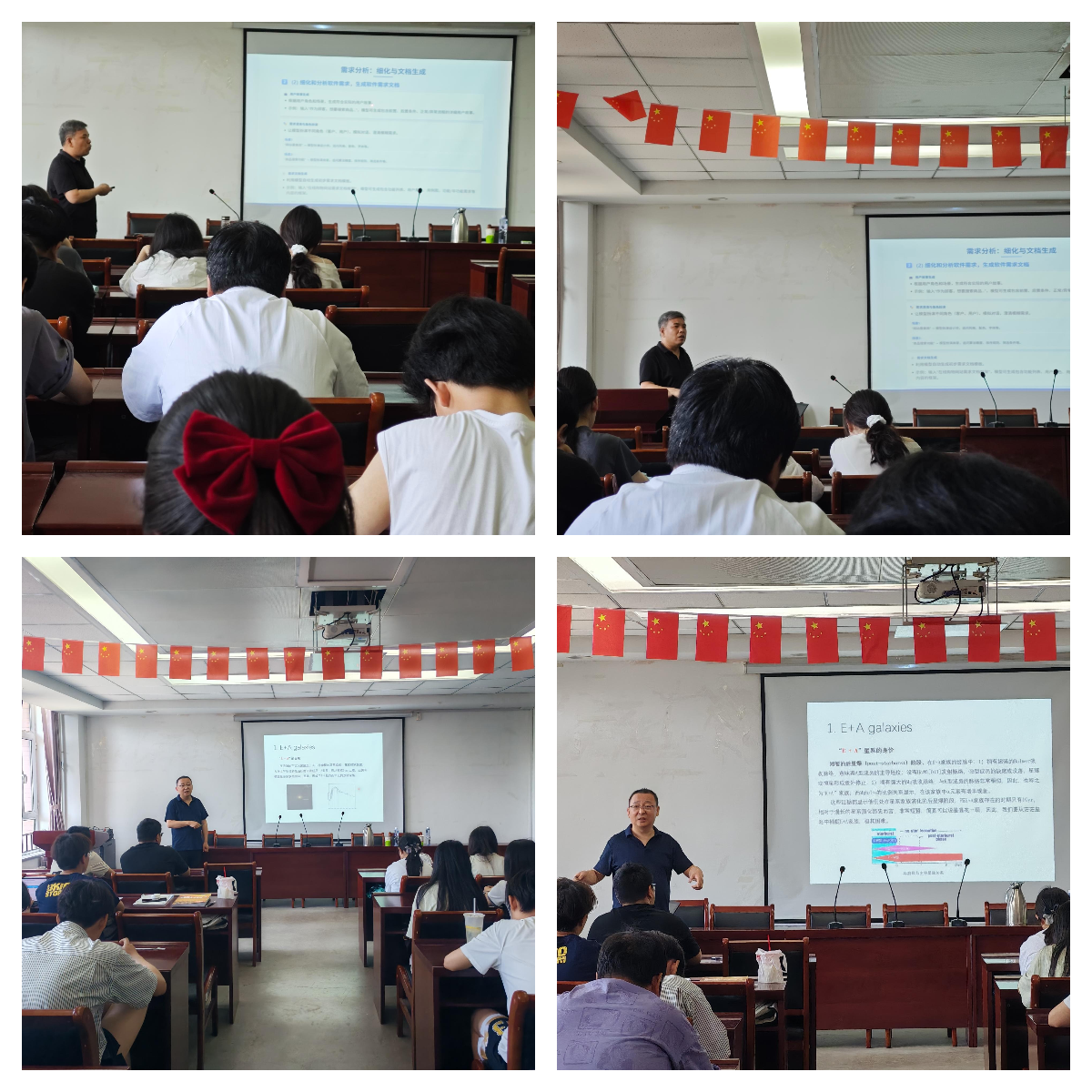 本次活动安排了学术报告、实验环境实地参观以及科研设施开放体验等内容,旨在激发师生对科研创新的兴趣与热情。活动中,谢斌红教授作了题为《基于大语言模型的软件工程开发实践》的报告,结合当前生成式人工智能的迅速崛起,系统介绍了大语言模型在软件开发领域中的实际应用与深远影响;杨海峰教授作了《天文大数据中稀有天体E+A星系识别》的报告分享,围绕E+A星系的典型光谱特征,带领大家领略了宇宙演化中不易察觉却极具科研价值的特殊天体,引发了在场师生对天文数据科学的浓厚兴趣。