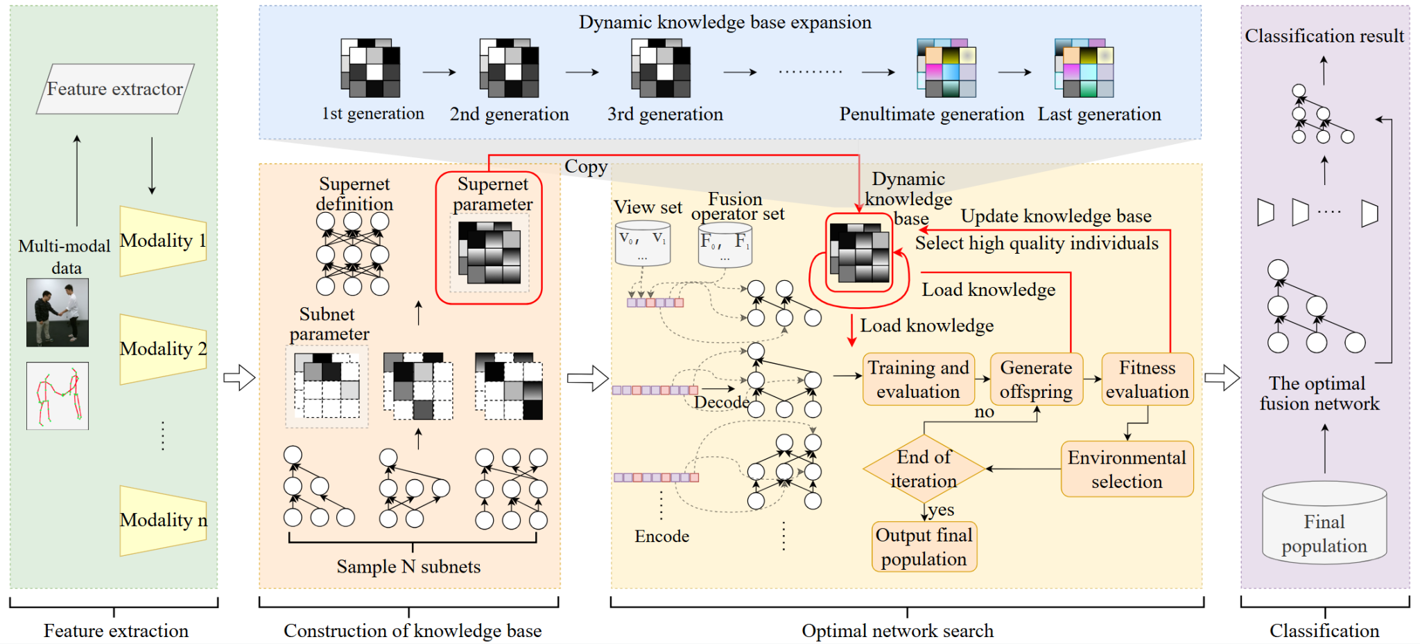 A Fast Neural Architecture Search Method for Multi-Modal Classification via Knowledge Sharing》通讯作者为郭倩教师,联合硕士生孙时武、张志霞教师、崔志华教授,以及山西大学钱宇华教授、梁新彦副教授共同完成。针对基于神经架构搜索的多模态分类方法在训练过程中广泛存在的耗时问题,该工作创新性地提出一种基于知识共享的快速神经架构搜索方法,其通过引入一个动态更新的知识库来优化搜索过程,从而显著减少计算资源的消耗,该方法的提出为本领域的提质增效提供了一个新的解决思路。