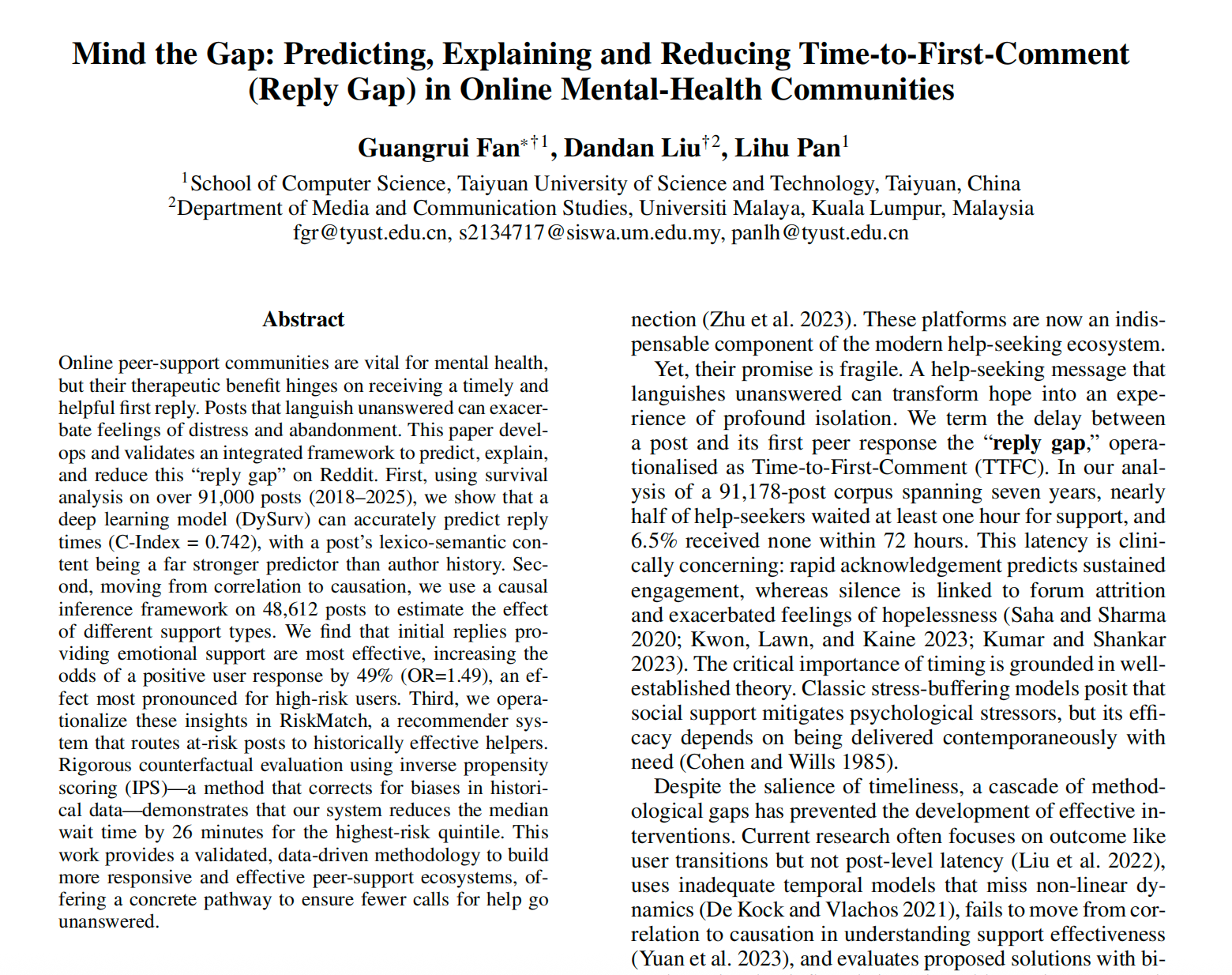 11月8日,中国计算机学会(CCF)推荐的A类国际学术会议AAAI 2026公布论文接收结果,我院樊光瑞老师的论文“Mind the Gap: Predicting, Explaining and Reducing Time-to-First-Comment (Reply Gap) in Online Mental-Health Communities”获得录用,这是我院在AAAI上的首次突破。