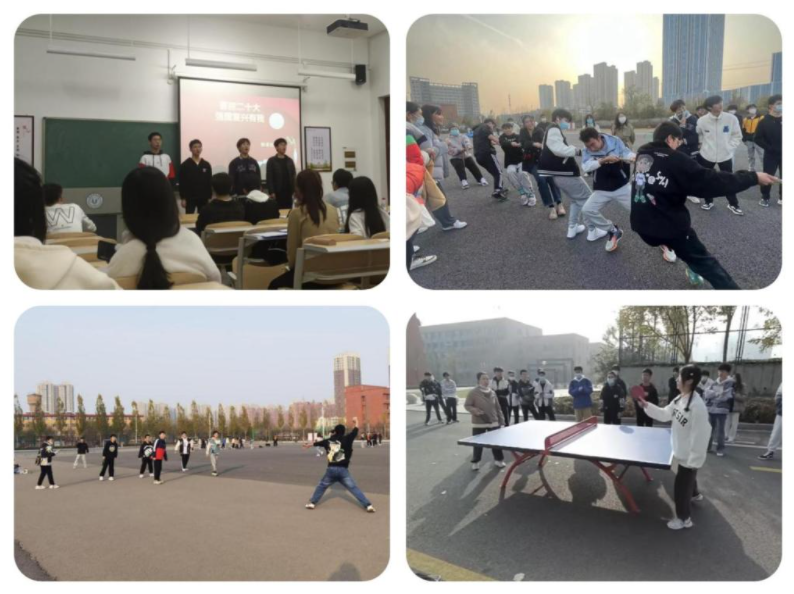 为了丰富封校期间同学们的校园生活,缓解学生心理压力和紧张情绪,学院将疫情防控与思想引领、学业指导、心理疏导相结合,在遵守疫情防控要求的前提下,学院团委线上、线下齐用力,积极开展了学习党的二十大精神主题演讲比赛、跳绳拔河、羽毛球比赛、乒乓球比赛等各类文体活动,引导学生走出宿舍,通过运动提升免疫力,做到封闭管理不孤单,打造活力校园生活。