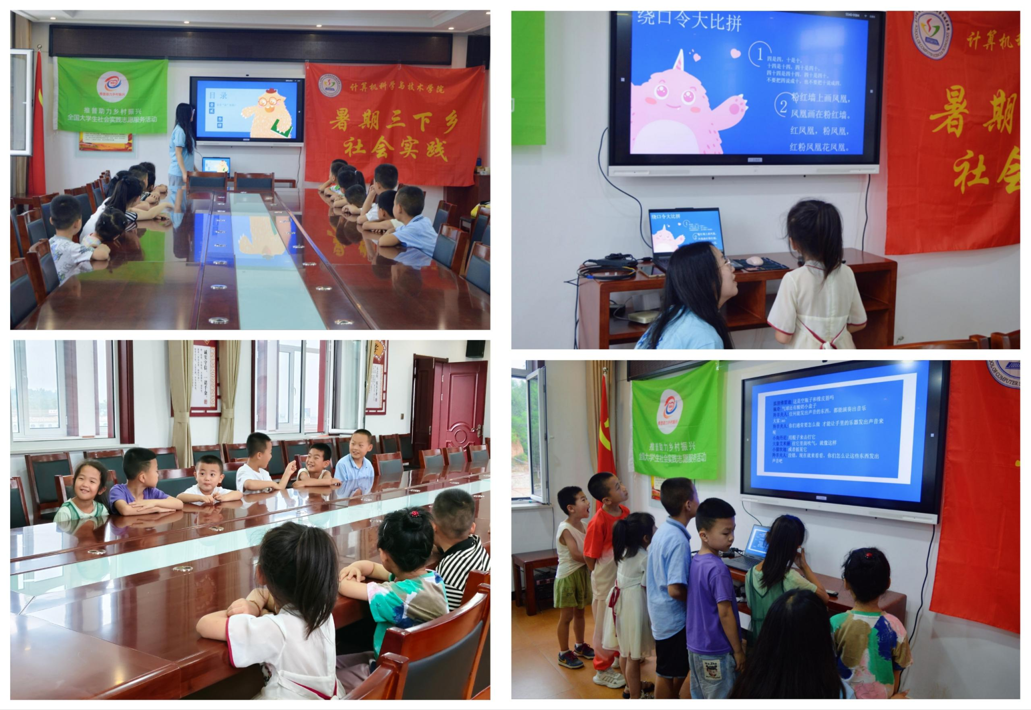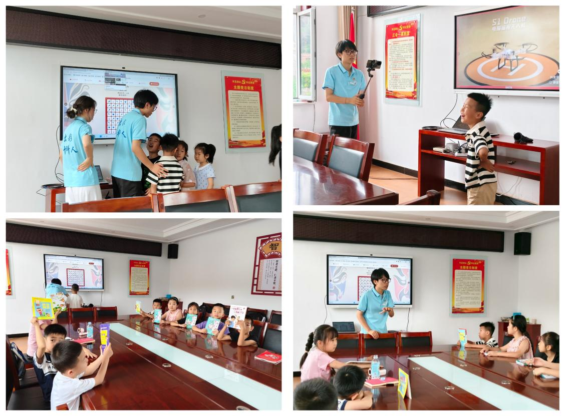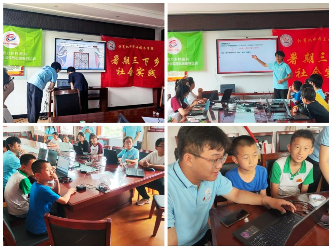 实践队充分发挥计算机专业优势,为当地6 - 15岁学生打造分层式青少年编程启蒙教学活动。针对小学低年级组,以“动画角色对话”为切入点,引导孩子们在拖动积木块的互动中理解程序顺序结构,悄然播下计算思维的种子;面向小学高年级和初中学生组,则通过设计交互式小动画展开教学,让孩子们在亲手创作的过程中深度感受编程的创造魅力。这堂“指尖魔法课”点燃了乡村青少年对信息技术的浓厚兴趣,为乡村振兴储备了充满潜力的 “数字生力军”。